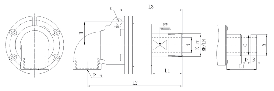 | Model | K | P | d | L1 | L2 | L3 | N | SW | H | 法蘭式外管尺寸對照表 | ||||
