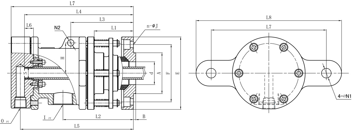 | Model | A | B | I | O | d | E | F | S | L1 | L2 | L3 | L4 | L5 | L6 | L7 | L8 | n-ΦJ | N1 | N2 | H |